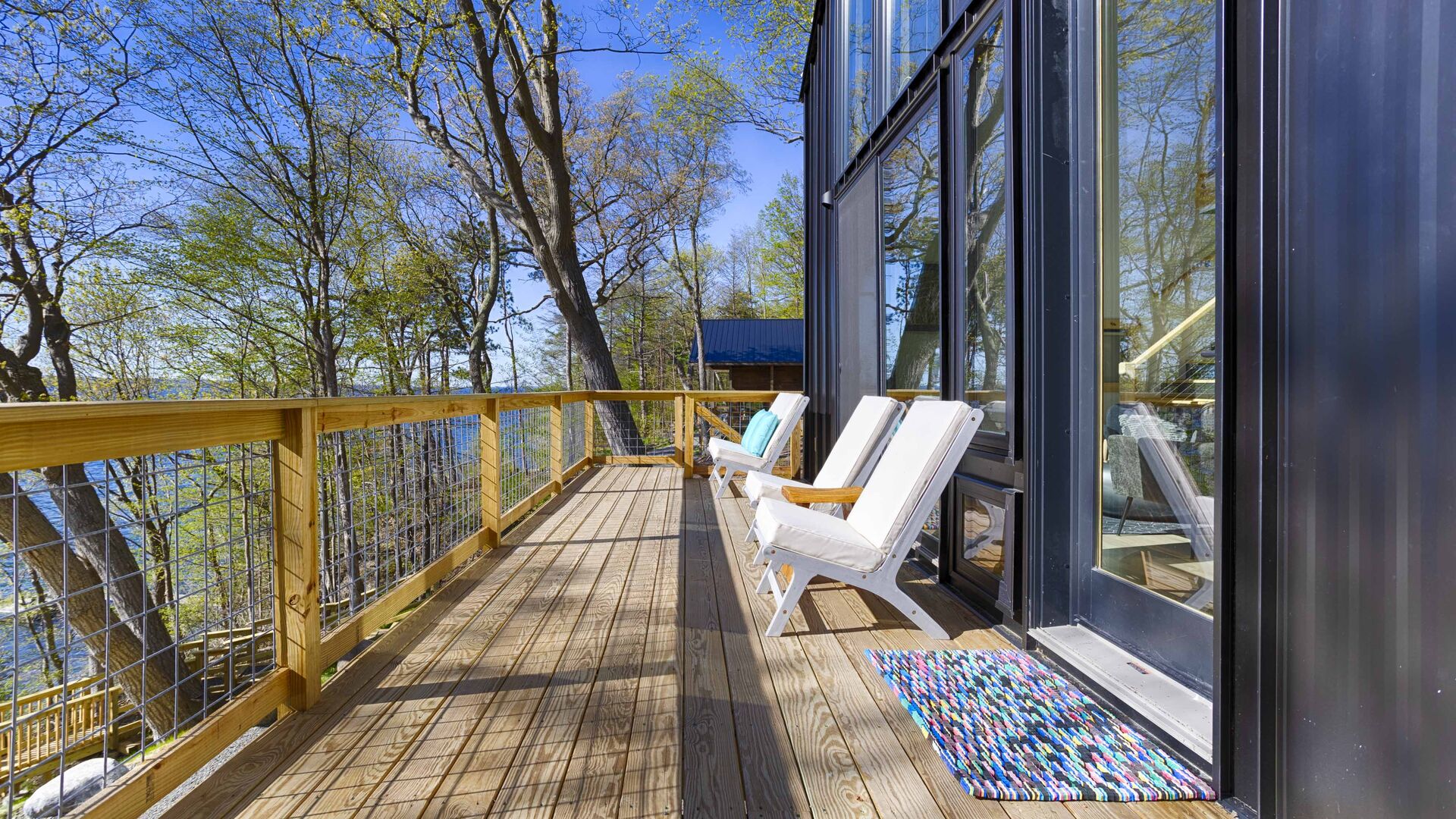 Architecturally unique, the soaring asymmetrical ceiling offers an unimpeded view, through a full wall of windows, of the forest and west facing sunsets over the lake. The kitchen/dining/living area opens onto a large wrap around deck, outdoor lounge seating, and hot tub. Don’t forget the private beach!
